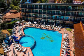 W drugiej lini brzegowej, ok. 100 m od publicznej piaszczystej plaży (przejście przez ulicę, serwis plażowy płatny), ok. półtora kilometra od centrum Słonecznego Brzegu, 4 km od Nessebaru, 40 km od lotniska w Burgas.